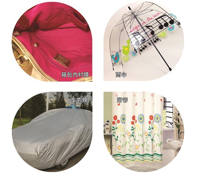 使用方向:箱包内衬膜,桌布膜,雨衣雨伞膜,车衣膜,空调罩和浴帘等日用品中的流延类薄膜。